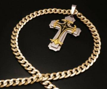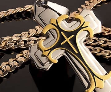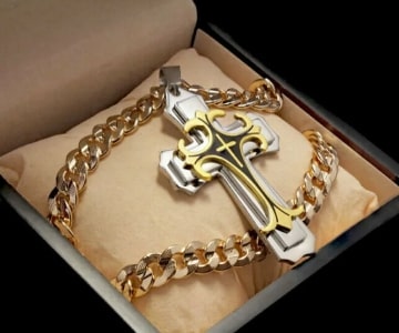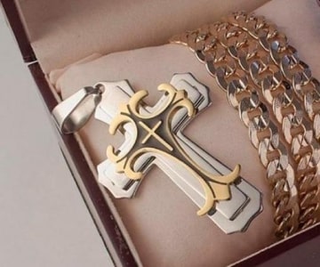 Чоловічий комплект має оригінальний дизайн. Поєднання хреста з різною фактурою чудово виглядає наживо! Велике "вушко" дозволить одягнути хрест на досить великий ланцюжок.